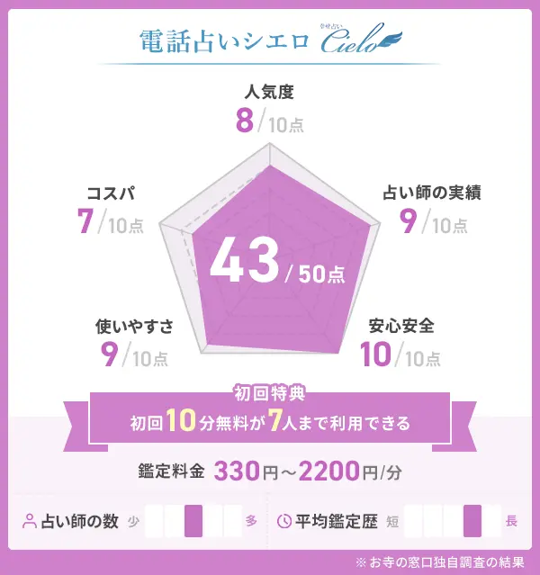 | 電話占いシエロ | 330円〜2,200円/分 | 最大50,000円分無料 | 約17年 | 131名 |