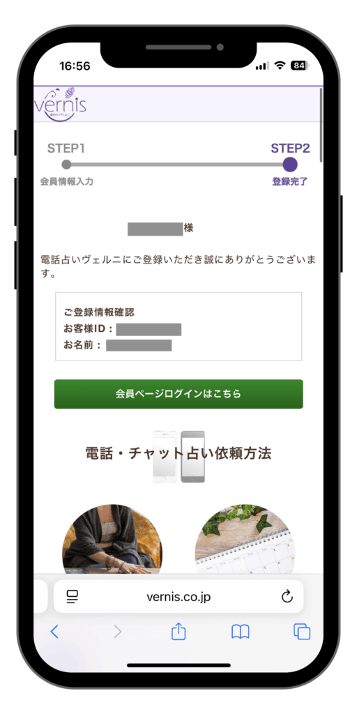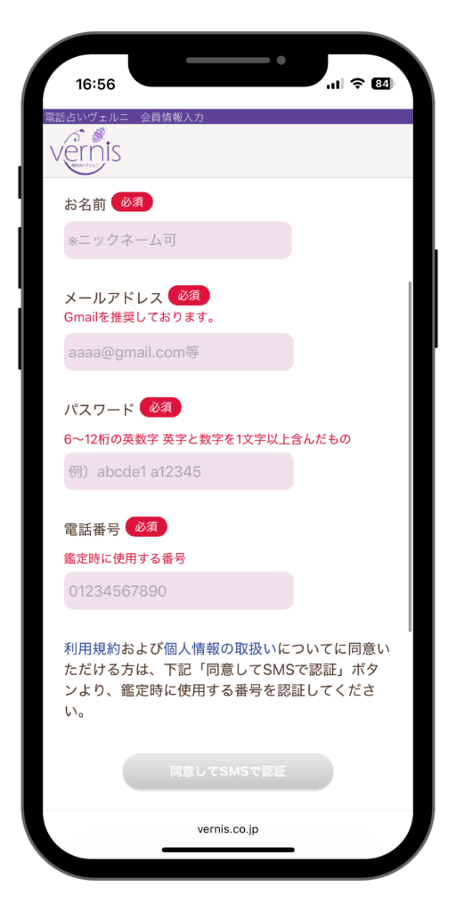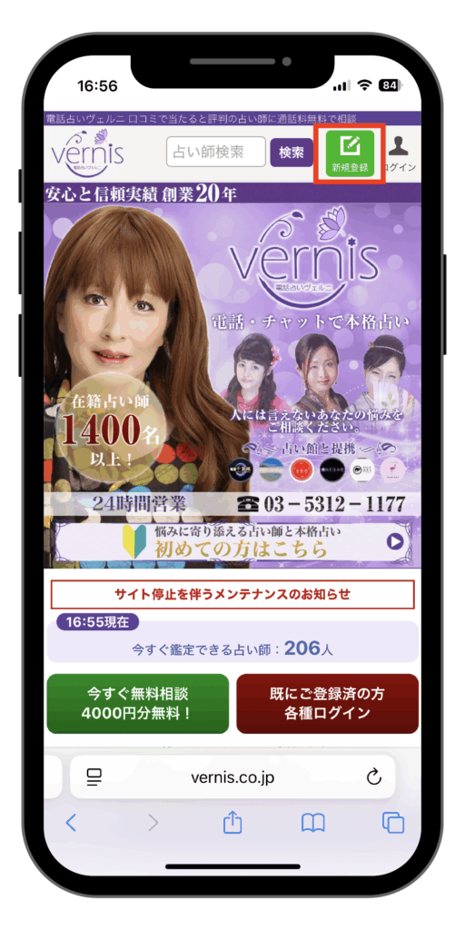 まずは電話占いヴェルニの公式サイト(https://vernis.co.jp/)にアクセスし、右上の「新規登録」をクリックしましょう。
