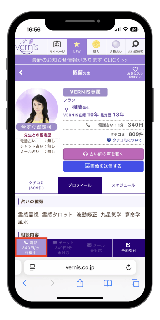 占いの種類や1分あたりの料金、過去のその先生との鑑定歴、占い師の声を事前に聞くことができます。