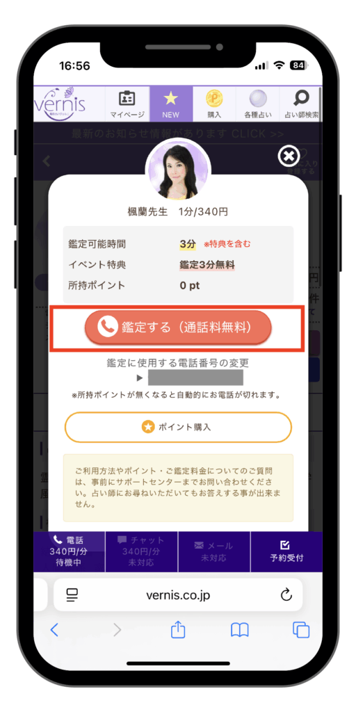 相談したい占い師が決まったら、占い師をクリックし左下の「電話」ボタンをクリック!
